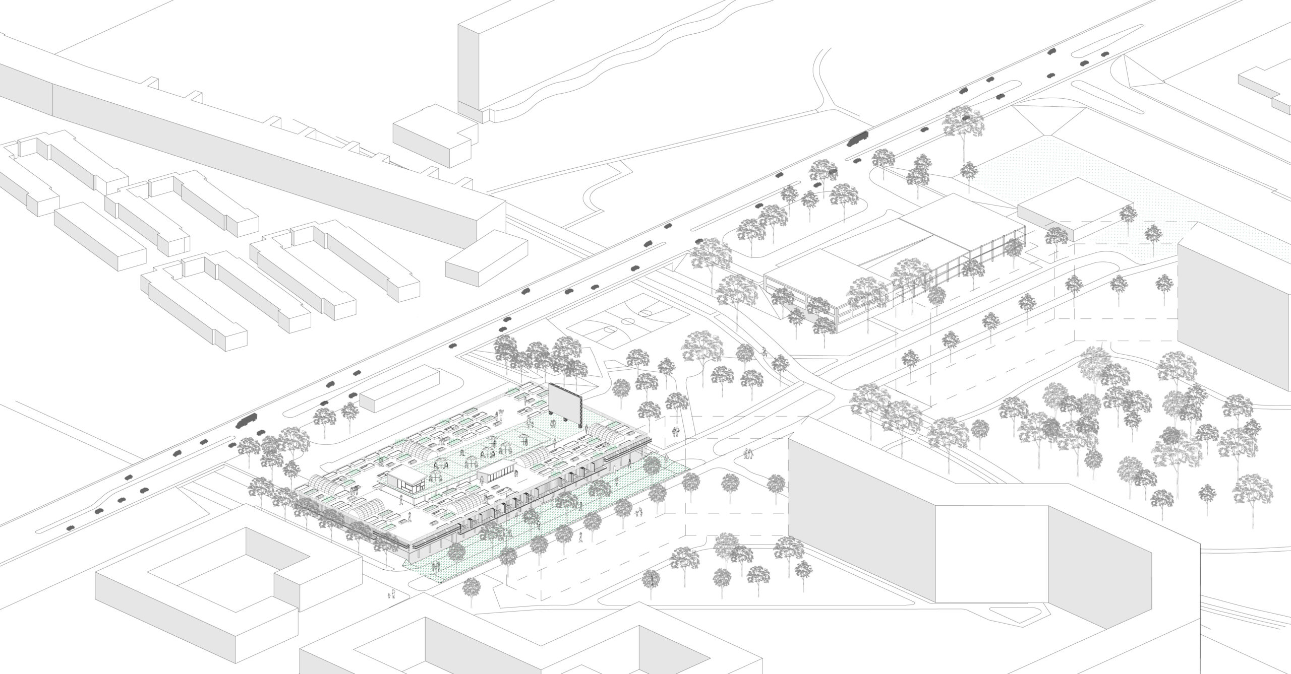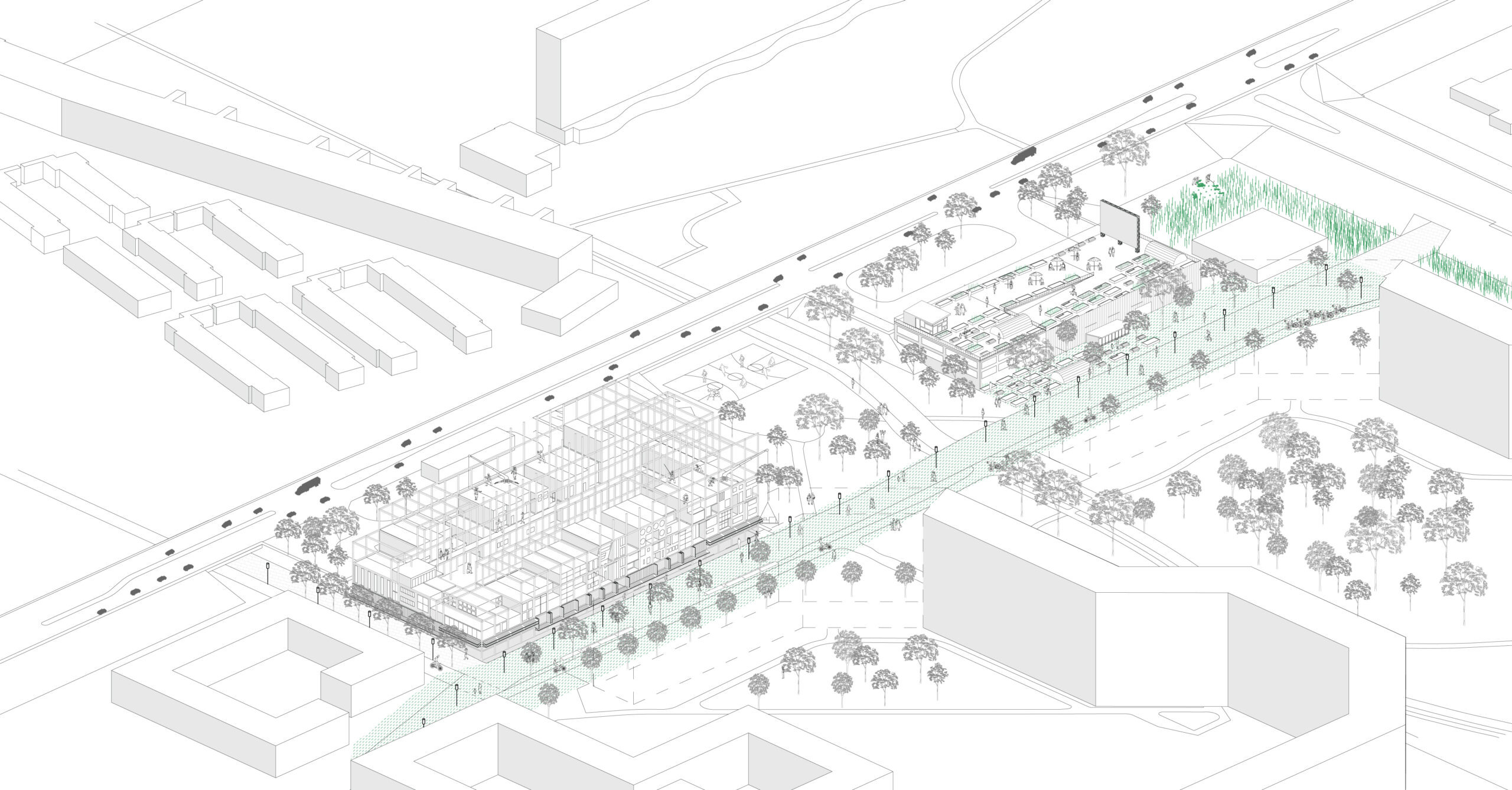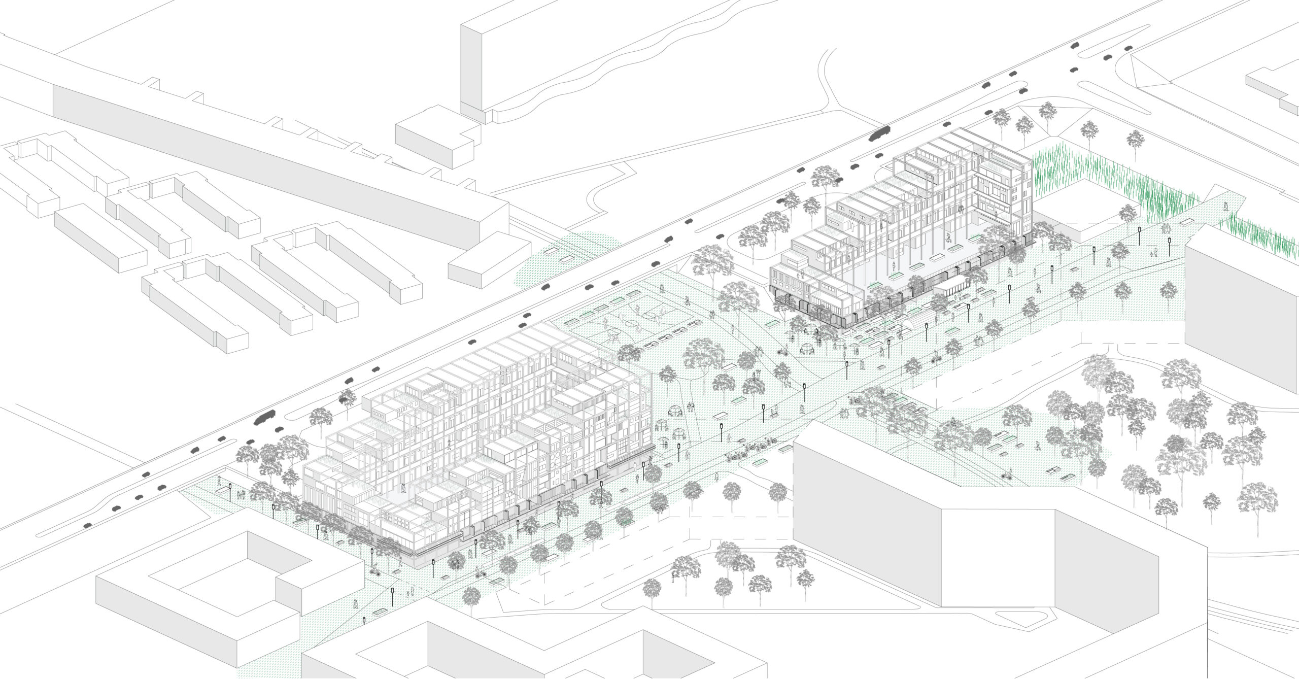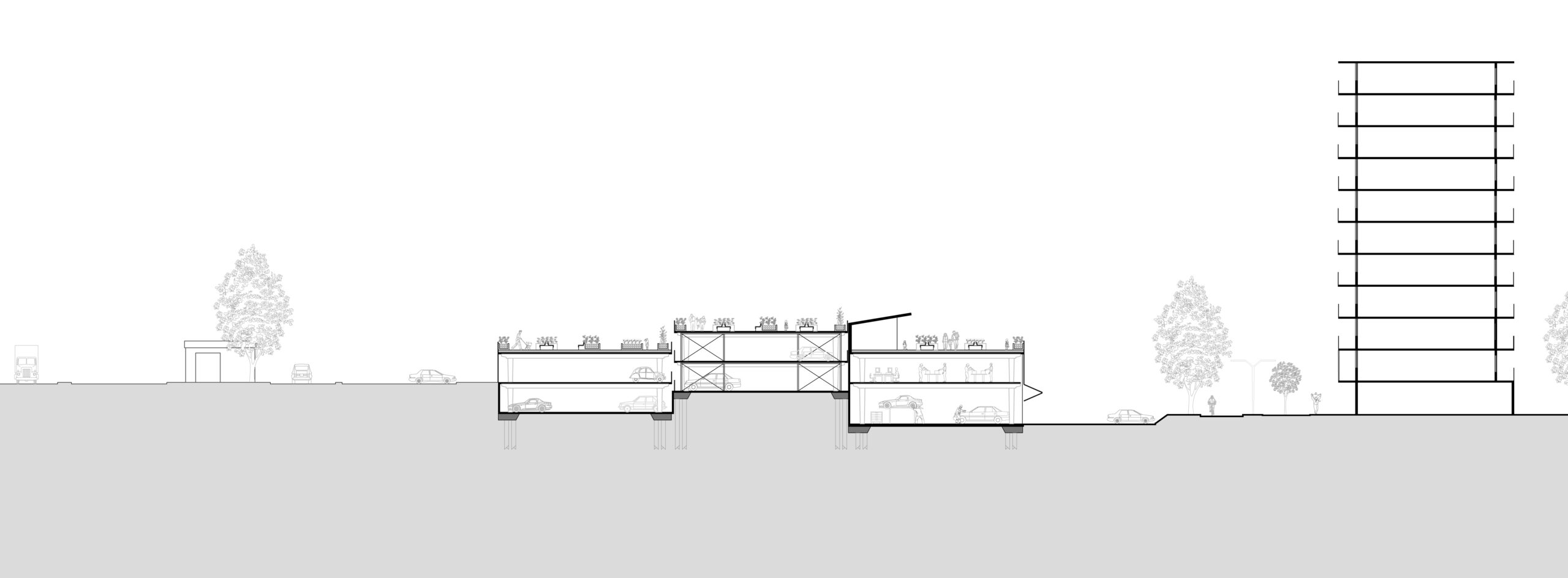 Na het gefaseerd ontwikkelingen van beide gebouwen verplaatsen de daktuinen naar de gerenoveerde publieke ruimte die de gebouwen omringt. De plinten kunnen nog steeds gebruikt worden door bewoners en buurtbewoners voor commerciƫle en horeca activiteiten. De onveilige sfeer van de leegstaande parkeergebouwen verdwijnt en wordt vervangen door een levendige groene straat met stadstuinen, terrassen, winkeltjes en ateliers waar bewoners elkaar kunnen ontmoeten.